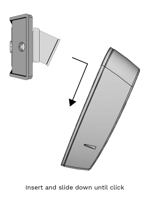 To mount the sensor at a corner, connect the two mounting brackets together and gently push the sensor into the T-shape latch at the corner bracket. Slide towards the middle of the sensor until you hear a click sound. Feed the wires through the rectangular slot in the middle of the bracket and connect to power.